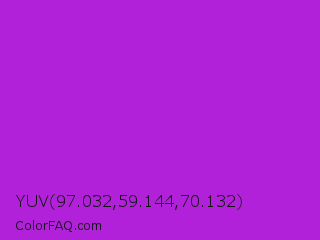 YUV 97.032,59.144,70.132 Color is a normal purple color and the nearest color is Vivid Mulberry #b80ce3. Hex code #b121d9 and RGB value is rgb(177,33,217). In RGB color space, this color is composed of 69% red, 13% green, 85% blue, In CMYK color space, this color is composed of 18% cyan, 85% magenta, 0% yellow , 15% black , In HSL color space, this color has a hue angle of 287° , 74% saturation and 49% lightness.