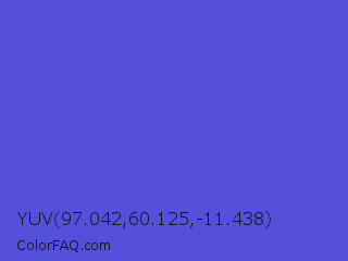 YUV 97.042,60.125,-11.438 Color is a normal indigo color and the nearest color is Majorelle Blue #6050dc. Hex code #5450db and RGB value is rgb(84,80,219). In RGB color space, this color is composed of 33% red, 31% green, 86% blue, In CMYK color space, this color is composed of 62% cyan, 63% magenta, 0% yellow , 14% black , In HSL color space, this color has a hue angle of 242° , 66% saturation and 59% lightness.