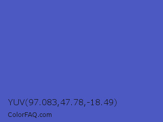 YUV 97.083,47.78,-18.49 Color is a normal blue color and the nearest color is Indigo #4f69c6. Hex code #4c59c2 and RGB value is rgb(76,89,194). In RGB color space, this color is composed of 30% red, 35% green, 76% blue, In CMYK color space, this color is composed of 61% cyan, 54% magenta, 0% yellow , 24% black , In HSL color space, this color has a hue angle of 233° , 49% saturation and 53% lightness.