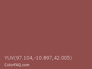 YUV 97.104,-10.897,42.005 Color is a normal red color and the nearest color is Copper Rust #944747. Hex code #914d4b and RGB value is rgb(145,77,75). In RGB color space, this color is composed of 57% red, 30% green, 29% blue, In CMYK color space, this color is composed of 0% cyan, 47% magenta, 48% yellow , 43% black , In HSL color space, this color has a hue angle of 2° , 32% saturation and 43% lightness.