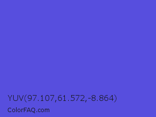 YUV 97.107,61.572,-8.864 Color is a normal indigo color and the nearest color is Majorelle Blue #6050dc. Hex code #574ede and RGB value is rgb(87,78,222). In RGB color space, this color is composed of 34% red, 31% green, 87% blue, In CMYK color space, this color is composed of 61% cyan, 65% magenta, 0% yellow , 13% black , In HSL color space, this color has a hue angle of 244° , 69% saturation and 59% lightness.