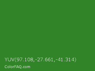 YUV 97.108,-27.661,-41.314 Color is a normal green color and the nearest color is Forest Green #228b22. Hex code #328429 and RGB value is rgb(50,132,41). In RGB color space, this color is composed of 20% red, 52% green, 16% blue, In CMYK color space, this color is composed of 62% cyan, 0% magenta, 69% yellow , 48% black , In HSL color space, this color has a hue angle of 114° , 53% saturation and 34% lightness.