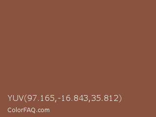 YUV 97.165,-16.843,35.812 Color is a normal orange color and the nearest color is Spicy Mix #885342. Hex code #8a533f and RGB value is rgb(138,83,63). In RGB color space, this color is composed of 54% red, 33% green, 25% blue, In CMYK color space, this color is composed of 0% cyan, 40% magenta, 54% yellow , 46% black , In HSL color space, this color has a hue angle of 16° , 37% saturation and 39% lightness.
