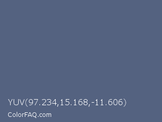 YUV 97.234,15.168,-11.606 Color is a normal blue color and the nearest color is Paynes Grey #536878. Hex code #546280 and RGB value is rgb(84,98,128). In RGB color space, this color is composed of 33% red, 38% green, 50% blue, In CMYK color space, this color is composed of 34% cyan, 23% magenta, 0% yellow , 50% black , In HSL color space, this color has a hue angle of 221° , 21% saturation and 42% lightness.