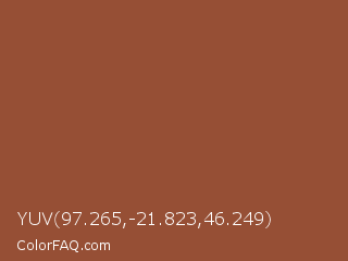 YUV 97.265,-21.823,46.249 Color is a normal orange color and the nearest color is Chestnut #954535. Hex code #964f35 and RGB value is rgb(150,79,53). In RGB color space, this color is composed of 59% red, 31% green, 21% blue, In CMYK color space, this color is composed of 0% cyan, 47% magenta, 65% yellow , 41% black , In HSL color space, this color has a hue angle of 16° , 48% saturation and 40% lightness.