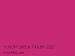 YUV 97.265,8.743,89.222 Color is a normal rose color and the nearest color is Telemagenta #cf3476. Hex code #c72a73 and RGB value is rgb(199,42,115). In RGB color space, this color is composed of 78% red, 16% green, 45% blue, In CMYK color space, this color is composed of 0% cyan, 79% magenta, 42% yellow , 22% black , In HSL color space, this color has a hue angle of 332° , 65% saturation and 47% lightness.