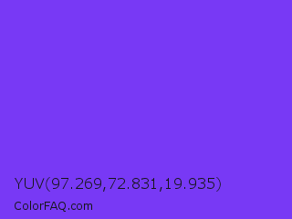 YUV 97.269,72.831,19.935 Color is a normal indigo color and the nearest color is Blue Violet #8a2be2. Hex code #7839f5 and RGB value is rgb(120,57,245). In RGB color space, this color is composed of 47% red, 22% green, 96% blue, In CMYK color space, this color is composed of 51% cyan, 77% magenta, 0% yellow , 4% black , In HSL color space, this color has a hue angle of 260° , 90% saturation and 59% lightness.