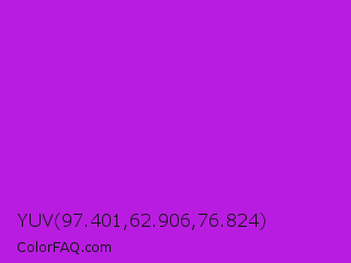 YUV 97.401,62.906,76.824 Color is a normal purple color and the nearest color is Vivid Mulberry #b80ce3. Hex code #b91ce1 and RGB value is rgb(185,28,225). In RGB color space, this color is composed of 73% red, 11% green, 88% blue, In CMYK color space, this color is composed of 18% cyan, 88% magenta, 0% yellow , 12% black , In HSL color space, this color has a hue angle of 288° , 78% saturation and 50% lightness.