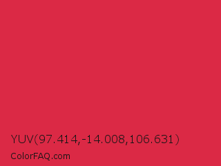 YUV 97.414,-14.008,106.631 Color is a normal red color and the nearest color is Rusty Red #da2c43. Hex code #db2945 and RGB value is rgb(219,41,69). In RGB color space, this color is composed of 86% red, 16% green, 27% blue, In CMYK color space, this color is composed of 0% cyan, 81% magenta, 68% yellow , 14% black , In HSL color space, this color has a hue angle of 351° , 71% saturation and 51% lightness.