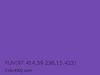 YUV 97.414,39.236,15.423 Color is a normal violet color and the nearest color is Studio #714ab2. Hex code #7349b1 and RGB value is rgb(115,73,177). In RGB color space, this color is composed of 45% red, 29% green, 69% blue, In CMYK color space, this color is composed of 35% cyan, 59% magenta, 0% yellow , 31% black , In HSL color space, this color has a hue angle of 264° , 42% saturation and 49% lightness.