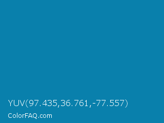 YUV 97.435,36.761,-77.557 Color is a normal blue color and the nearest color is Deep Cerulean #007ba7. Hex code #0980ac and RGB value is rgb(9,128,172). In RGB color space, this color is composed of 4% red, 50% green, 67% blue, In CMYK color space, this color is composed of 95% cyan, 26% magenta, 0% yellow , 33% black , In HSL color space, this color has a hue angle of 196° , 90% saturation and 35% lightness.