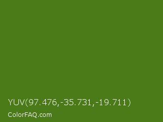 YUV 97.476,-35.731,-19.711 Color is a dark green color and the nearest color is Sap Green #507d2a. Hex code #4b7b19 and RGB value is rgb(75,123,25). In RGB color space, this color is composed of 29% red, 48% green, 10% blue, In CMYK color space, this color is composed of 39% cyan, 0% magenta, 80% yellow , 52% black , In HSL color space, this color has a hue angle of 89° , 66% saturation and 29% lightness.