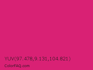 YUV 97.478,9.131,104.821 Color is a normal rose color and the nearest color is Vivid Cerise #da1d81. Hex code #d92174 and RGB value is rgb(217,33,116). In RGB color space, this color is composed of 85% red, 13% green, 45% blue, In CMYK color space, this color is composed of 0% cyan, 85% magenta, 47% yellow , 15% black , In HSL color space, this color has a hue angle of 333° , 74% saturation and 49% lightness.