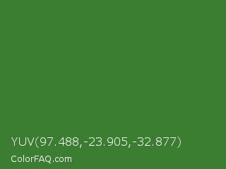 YUV 97.488,-23.905,-32.877 Color is a normal green color and the nearest color is Sap Green #507d2a. Hex code #3c7e31 and RGB value is rgb(60,126,49). In RGB color space, this color is composed of 24% red, 49% green, 19% blue, In CMYK color space, this color is composed of 52% cyan, 0% magenta, 61% yellow , 51% black , In HSL color space, this color has a hue angle of 111° , 44% saturation and 34% lightness.