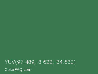 YUV 97.489,-8.622,-34.632 Color is a normal green color and the nearest color is Goblin #3d7d52. Hex code #3a7950 and RGB value is rgb(58,121,80). In RGB color space, this color is composed of 23% red, 47% green, 31% blue, In CMYK color space, this color is composed of 52% cyan, 0% magenta, 34% yellow , 53% black , In HSL color space, this color has a hue angle of 141° , 35% saturation and 35% lightness.