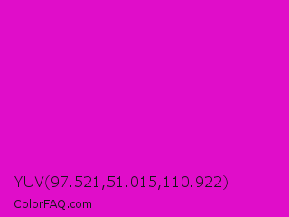 YUV 97.521,51.015,110.922 Color is a normal magenta color and the nearest color is Deep Magenta #cc00cc. Hex code #e00dc9 and RGB value is rgb(224,13,201). In RGB color space, this color is composed of 88% red, 5% green, 79% blue, In CMYK color space, this color is composed of 0% cyan, 94% magenta, 10% yellow , 12% black , In HSL color space, this color has a hue angle of 307° , 89% saturation and 46% lightness.