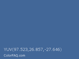 YUV 97.523,26.857,-27.646 Color is a normal blue color and the nearest color is Queen Blue #436b95. Hex code #426798 and RGB value is rgb(66,103,152). In RGB color space, this color is composed of 26% red, 40% green, 60% blue, In CMYK color space, this color is composed of 57% cyan, 32% magenta, 0% yellow , 40% black , In HSL color space, this color has a hue angle of 214° , 39% saturation and 43% lightness.