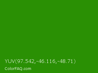 YUV 97.542,-46.116,-48.71 Color is a dark green color and the nearest color is Napier Green #2a8000. Hex code #2a9004 and RGB value is rgb(42,144,4). In RGB color space, this color is composed of 16% red, 56% green, 2% blue, In CMYK color space, this color is composed of 71% cyan, 0% magenta, 97% yellow , 44% black , In HSL color space, this color has a hue angle of 104° , 95% saturation and 29% lightness.