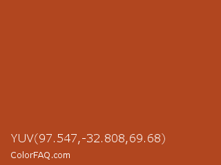 YUV 97.547,-32.808,69.68 Color is a normal orange color and the nearest color is Chinese Red #aa381e. Hex code #b1461f and RGB value is rgb(177,70,31). In RGB color space, this color is composed of 69% red, 27% green, 12% blue, In CMYK color space, this color is composed of 0% cyan, 60% magenta, 82% yellow , 31% black , In HSL color space, this color has a hue angle of 16° , 70% saturation and 41% lightness.