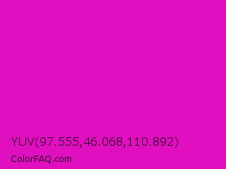 YUV 97.555,46.068,110.892 Color is a normal magenta color and the nearest color is Shocking Pink #fc0fc0. Hex code #e00fbf and RGB value is rgb(224,15,191). In RGB color space, this color is composed of 88% red, 6% green, 75% blue, In CMYK color space, this color is composed of 0% cyan, 93% magenta, 15% yellow , 12% black , In HSL color space, this color has a hue angle of 309° , 87% saturation and 47% lightness.