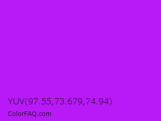 YUV 97.55,73.679,74.94 Color is a normal purple color and the nearest color is Vivid Mulberry #b80ce3. Hex code #b719f7 and RGB value is rgb(183,25,247). In RGB color space, this color is composed of 72% red, 10% green, 97% blue, In CMYK color space, this color is composed of 26% cyan, 90% magenta, 0% yellow , 3% black , In HSL color space, this color has a hue angle of 283° , 93% saturation and 53% lightness.