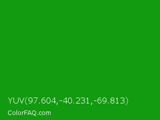 YUV 97.604,-40.231,-69.813 Color is a normal green color and the nearest color is India Green #138808. Hex code #129a10 and RGB value is rgb(18,154,16). In RGB color space, this color is composed of 7% red, 60% green, 6% blue, In CMYK color space, this color is composed of 88% cyan, 0% magenta, 90% yellow , 40% black , In HSL color space, this color has a hue angle of 119° , 81% saturation and 33% lightness.