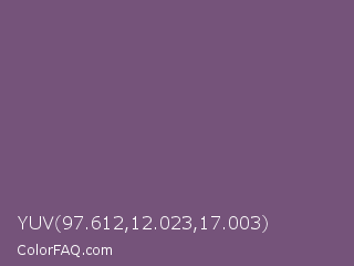 YUV 97.612,12.023,17.003 Color is a normal magenta color and the nearest color is Salt Box #685e6e. Hex code #75537a and RGB value is rgb(117,83,122). In RGB color space, this color is composed of 46% red, 33% green, 48% blue, In CMYK color space, this color is composed of 4% cyan, 32% magenta, 0% yellow , 52% black , In HSL color space, this color has a hue angle of 292° , 19% saturation and 40% lightness.