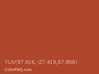 YUV 97.616,-27.419,67.866 Color is a normal red color and the nearest color is Medium Carmine #af4035. Hex code #af452a and RGB value is rgb(175,69,42). In RGB color space, this color is composed of 69% red, 27% green, 16% blue, In CMYK color space, this color is composed of 0% cyan, 61% magenta, 76% yellow , 31% black , In HSL color space, this color has a hue angle of 12° , 61% saturation and 43% lightness.