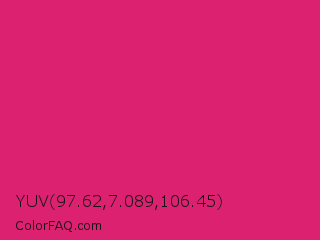 YUV 97.62,7.089,106.45 Color is a normal rose color and the nearest color is Razzmatazz #e3256b. Hex code #db2170 and RGB value is rgb(219,33,112). In RGB color space, this color is composed of 86% red, 13% green, 44% blue, In CMYK color space, this color is composed of 0% cyan, 85% magenta, 49% yellow , 14% black , In HSL color space, this color has a hue angle of 335° , 74% saturation and 49% lightness.