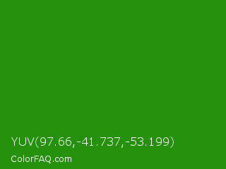YUV 97.66,-41.737,-53.199 Color is a normal green color and the nearest color is Slimy Green #299617. Hex code #25910d and RGB value is rgb(37,145,13). In RGB color space, this color is composed of 15% red, 57% green, 5% blue, In CMYK color space, this color is composed of 74% cyan, 0% magenta, 91% yellow , 43% black , In HSL color space, this color has a hue angle of 109° , 84% saturation and 31% lightness.