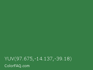 YUV 97.675,-14.137,-39.18 Color is a normal green color and the nearest color is Goblin #3d7d52. Hex code #357e45 and RGB value is rgb(53,126,69). In RGB color space, this color is composed of 21% red, 49% green, 27% blue, In CMYK color space, this color is composed of 58% cyan, 0% magenta, 45% yellow , 51% black , In HSL color space, this color has a hue angle of 133° , 41% saturation and 35% lightness.