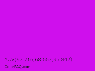 YUV 97.716,68.667,95.842 Color is a normal magenta color and the nearest color is Vivid Orchid #cc00ff. Hex code #cf0fed and RGB value is rgb(207,15,237). In RGB color space, this color is composed of 81% red, 6% green, 93% blue, In CMYK color space, this color is composed of 13% cyan, 94% magenta, 0% yellow , 7% black , In HSL color space, this color has a hue angle of 292° , 88% saturation and 49% lightness.
