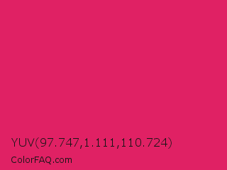 YUV 97.747,1.111,110.724 Color is a normal rose color and the nearest color is Razzmatazz #e3256b. Hex code #e02164 and RGB value is rgb(224,33,100). In RGB color space, this color is composed of 88% red, 13% green, 39% blue, In CMYK color space, this color is composed of 0% cyan, 85% magenta, 55% yellow , 12% black , In HSL color space, this color has a hue angle of 339° , 75% saturation and 50% lightness.