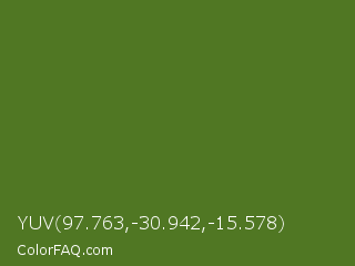 YUV 97.763,-30.942,-15.578 Color is a dark green color and the nearest color is Sap Green #507d2a. Hex code #507723 and RGB value is rgb(80,119,35). In RGB color space, this color is composed of 31% red, 47% green, 14% blue, In CMYK color space, this color is composed of 33% cyan, 0% magenta, 71% yellow , 53% black , In HSL color space, this color has a hue angle of 88° , 55% saturation and 30% lightness.