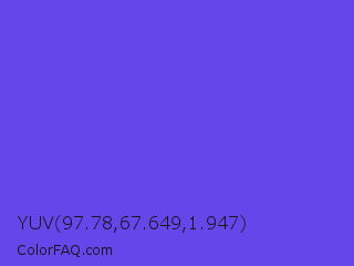 YUV 97.78,67.649,1.947 Color is a normal indigo color and the nearest color is Majorelle Blue #6050dc. Hex code #6446eb and RGB value is rgb(100,70,235). In RGB color space, this color is composed of 39% red, 27% green, 92% blue, In CMYK color space, this color is composed of 57% cyan, 70% magenta, 0% yellow , 8% black , In HSL color space, this color has a hue angle of 251° , 80% saturation and 60% lightness.