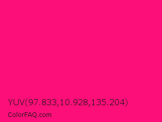 YUV 97.833,10.928,135.204 Color is a normal rose color and the nearest color is Winter Sky #ff007c. Hex code #fc0f78 and RGB value is rgb(252,15,120). In RGB color space, this color is composed of 99% red, 6% green, 47% blue, In CMYK color space, this color is composed of 0% cyan, 94% magenta, 52% yellow , 1% black , In HSL color space, this color has a hue angle of 333° , 98% saturation and 52% lightness.