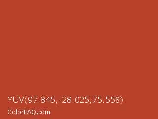 YUV 97.845,-28.025,75.558 Color is a normal red color and the nearest color is Dark Pastel Red #c23b22. Hex code #b84129 and RGB value is rgb(184,65,41). In RGB color space, this color is composed of 72% red, 25% green, 16% blue, In CMYK color space, this color is composed of 0% cyan, 65% magenta, 78% yellow , 28% black , In HSL color space, this color has a hue angle of 10° , 64% saturation and 44% lightness.