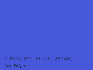 YUV 97.851,59.726,-23.548 Color is a normal blue color and the nearest color is Royal Blue #4169e1. Hex code #4758db and RGB value is rgb(71,88,219). In RGB color space, this color is composed of 28% red, 35% green, 86% blue, In CMYK color space, this color is composed of 68% cyan, 60% magenta, 0% yellow , 14% black , In HSL color space, this color has a hue angle of 233° , 67% saturation and 57% lightness.