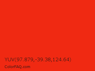 YUV 97.879,-39.38,124.64 Color is a normal red color and the nearest color is Red RYB #fe2712. Hex code #f02912 and RGB value is rgb(240,41,18). In RGB color space, this color is composed of 94% red, 16% green, 7% blue, In CMYK color space, this color is composed of 0% cyan, 83% magenta, 93% yellow , 6% black , In HSL color space, this color has a hue angle of 6° , 88% saturation and 51% lightness.