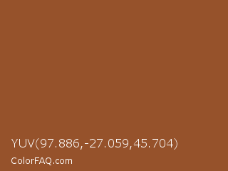 YUV 97.886,-27.059,45.704 Color is a normal orange color and the nearest color is Mule Fawn #8c472f. Hex code #96522b and RGB value is rgb(150,82,43). In RGB color space, this color is composed of 59% red, 32% green, 17% blue, In CMYK color space, this color is composed of 0% cyan, 45% magenta, 71% yellow , 41% black , In HSL color space, this color has a hue angle of 22° , 55% saturation and 38% lightness.