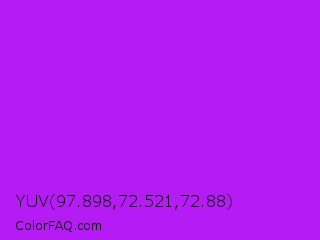 YUV 97.898,72.521,72.88 Color is a normal purple color and the nearest color is Veronica #a020f0. Hex code #b51bf5 and RGB value is rgb(181,27,245). In RGB color space, this color is composed of 71% red, 11% green, 96% blue, In CMYK color space, this color is composed of 26% cyan, 89% magenta, 0% yellow , 4% black , In HSL color space, this color has a hue angle of 282° , 92% saturation and 53% lightness.