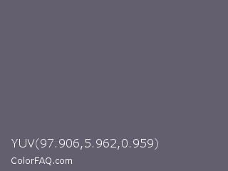YUV 97.906,5.962,0.959 Color is a normal indigo color and the nearest color is Mid Gray #5f5f6e. Hex code #635f6e and RGB value is rgb(99,95,110). In RGB color space, this color is composed of 39% red, 37% green, 43% blue, In CMYK color space, this color is composed of 10% cyan, 14% magenta, 0% yellow , 57% black , In HSL color space, this color has a hue angle of 256° , 7% saturation and 40% lightness.