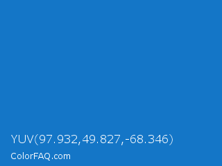 YUV 97.932,49.827,-68.346 Color is a normal blue color and the nearest color is Bright Navy Blue #1974d2. Hex code #1476c7 and RGB value is rgb(20,118,199). In RGB color space, this color is composed of 8% red, 46% green, 78% blue, In CMYK color space, this color is composed of 90% cyan, 41% magenta, 0% yellow , 22% black , In HSL color space, this color has a hue angle of 207° , 82% saturation and 43% lightness.
