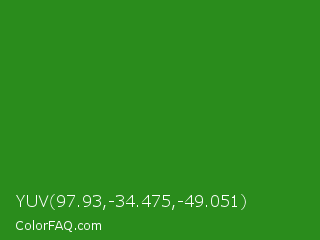 YUV 97.93,-34.475,-49.051 Color is a normal green color and the nearest color is Forest Green #228b22. Hex code #2a8c1c and RGB value is rgb(42,140,28). In RGB color space, this color is composed of 16% red, 55% green, 11% blue, In CMYK color space, this color is composed of 70% cyan, 0% magenta, 80% yellow , 45% black , In HSL color space, this color has a hue angle of 113° , 67% saturation and 33% lightness.