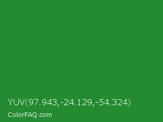 YUV 97.943,-24.129,-54.324 Color is a normal green color and the nearest color is Forest Green #228b22. Hex code #248b31 and RGB value is rgb(36,139,49). In RGB color space, this color is composed of 14% red, 55% green, 19% blue, In CMYK color space, this color is composed of 74% cyan, 0% magenta, 65% yellow , 45% black , In HSL color space, this color has a hue angle of 128° , 59% saturation and 34% lightness.