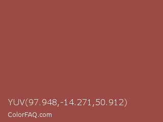 YUV 97.948,-14.271,50.912 Color is a normal red color and the nearest color is Copper Rust #944747. Hex code #9c4a45 and RGB value is rgb(156,74,69). In RGB color space, this color is composed of 61% red, 29% green, 27% blue, In CMYK color space, this color is composed of 0% cyan, 53% magenta, 56% yellow , 39% black , In HSL color space, this color has a hue angle of 3° , 39% saturation and 44% lightness.