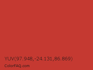 YUV 97.948,-24.131,86.869 Color is a normal red color and the nearest color is International Orange Golden Gate Bridge #c0362c. Hex code #c53931 and RGB value is rgb(197,57,49). In RGB color space, this color is composed of 77% red, 22% green, 19% blue, In CMYK color space, this color is composed of 0% cyan, 71% magenta, 75% yellow , 23% black , In HSL color space, this color has a hue angle of 3° , 60% saturation and 48% lightness.