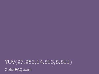 YUV 97.953,14.813,8.811 Color is a normal purple color and the nearest color is Dolphin #646077. Hex code #6c5780 and RGB value is rgb(108,87,128). In RGB color space, this color is composed of 42% red, 34% green, 50% blue, In CMYK color space, this color is composed of 16% cyan, 32% magenta, 0% yellow , 50% black , In HSL color space, this color has a hue angle of 271° , 19% saturation and 42% lightness.