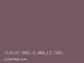 YUV 97.985,-0.486,15.799 Color is a normal rose color and the nearest color is Russett #755a57. Hex code #745961 and RGB value is rgb(116,89,97). In RGB color space, this color is composed of 45% red, 35% green, 38% blue, In CMYK color space, this color is composed of 0% cyan, 23% magenta, 16% yellow , 55% black , In HSL color space, this color has a hue angle of 342° , 13% saturation and 40% lightness.