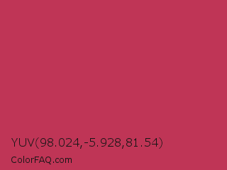 YUV 98.024,-5.928,81.54 Color is a normal red color and the nearest color is Dingy Dungeon #c53151. Hex code #bf3556 and RGB value is rgb(191,53,86). In RGB color space, this color is composed of 75% red, 21% green, 34% blue, In CMYK color space, this color is composed of 0% cyan, 72% magenta, 55% yellow , 25% black , In HSL color space, this color has a hue angle of 346° , 57% saturation and 48% lightness.